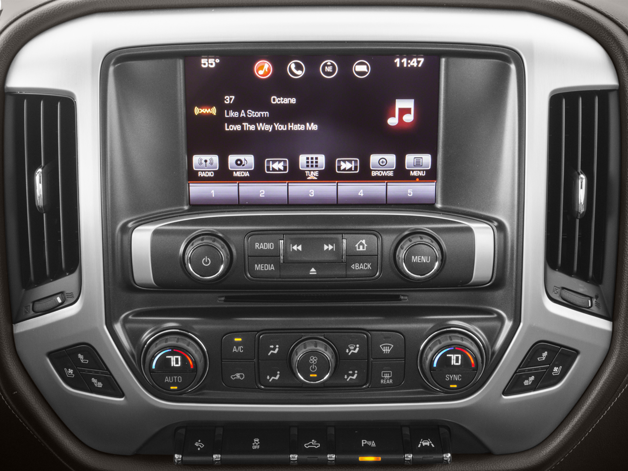 **Enhanced Driver Alert Package: Lane Keep Assist; Forward Collision Alert; Low Speed Forward Automatic Braking; Ultrasonic Front and Rear Park Assist; IntelliBeam Automatic High Beam On/off Headlight SLT Crew Cab Premium Plus Package Preferred Equipment Group 4SA: LED Cargo Box Lighting; EZ Lift and Lower Tailgate; Chrome Door Handles; Rear 60/40 Folding Bench Seat (folds Up); Remote Vehicle Starter System; 5.3L EcoTec3 V8 Engine; Electric Rear Window Defogger; Theft Deterrent System (unauthorized Entry); Auxiliary External Transmission Oil Cooler; 4.2" Diagonal Color Display Driver Info Center; Trailering Equipment; 110-Volt AC Power Outlet; Thin Profile LED Fog Lamps; 150 Amp Alternator; Steering Wheel Audio Controls; Universal Home Remote; Color-Keyed Carpeting; Power Windows with Driver Express Up and Down; OnStar and GMC Connected Services Capable; Remote Keyless Entry; P265/70R17 AS BW Spare Tire; Single Slot CD/MP3 Player; 2-Speed Active Electronic Autotrac Transfer Case; 1st and 2nd Row Color-Keyed Carpeted Floor Mats; Deep-Tinted Glass; Dual-Zone Automatic Climate Control; Power Folding and Adjustable Heated Outside Mirrors; Chrome Mirror Caps; Leather Wrapped Steer