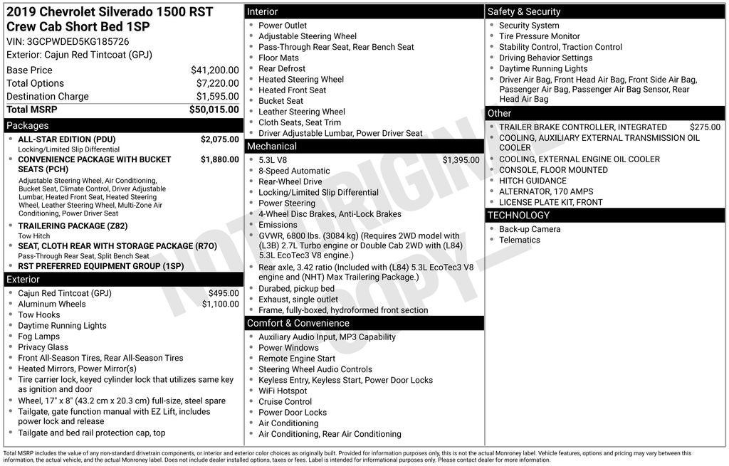 Vaden is pleased to offer 2019 Chevrolet Silverado 1500 RST in Red Tintcoat, Beautifully equipped with all the essentials and then some! All-Star Edition (Heavy-Duty Rear Locking Differential), Cloth Rear Seat w/Storage Package, Convenience Package (10-Way Power Driver Seat w/Lumbar, Dual-Zone Automatic Climate Control, Heated Driver & Front Passenger Seats, Heated Steering Wheel, Leather Wrapped Steering Wheel, and Manual Tilt/Telescoping Steering Column), Convenience Package w/Buckets Seats (Floor Mounted Console and Front Bucket Seats), Preferred Equipment Group 1SP (12-Volt Rear Auxiliary Power Outlet, 2 USB Ports (First Row), 4-Way Manual Driver Seat Adjuster, 4.2 Diagonal Color Display Driver Info Center, 6-Speaker Audio System, Bluetooth® For Phone, Body Color Grille, Chevrolet Connected Access, Chevrolet w/4G LTE, Color-Keyed Carpeting Floor Covering, Compass, Deep-Tinted Glass, Electric Rear-Window Defogger, Electrical Lock Control Steering Column, Electronic Cruise Control, Front Frame-Mounted Black Recovery Hooks, Front LED Fog Lamps, Front Rubberized Vinyl Floor Mats, High Gloss Black Mirror Caps, Keyless Open & Start, LED Cargo Area Lighting, Manual Tilt Wheel Steering Column, OnStar & Chevrolet Connected Services Capable, Power Door Locks, Power Front Windows w/Driver Express Up/Down, Power Front Windows w/Passenger Express Down, Power Rear Windows w/Express Down, Rear 60/40 Folding Bench Seat (Folds Up), Rear Dual USB Charging-Only Ports, Rear Rubberized-Vinyl Floor Mats, Rear Vision Camera, Remote Vehicle Starter System, Single-Zone Manual/Semi-Automatic Air Conditioning, Steering Wheel Audio Controls, Theft Deterrent System (Unauthorized Entry), and Urethane Steering Wheel), Trailering Package (Hitch Guidance), 8-Speed Automatic, Jet Black w/Cloth Seat Trim, 170 Amp Alternator, 220 Amps Alternator, 3.23 Rear Axle Ratio, 4-Wheel Disc Brakes, 40/20/40 Front Split-Bench Seat, 6 Speakers, ABS brakes, Air Conditioning, Alloy wheels, AM/FM radio, Apple CarPlay/Android Auto, Auxiliary External Transmission Oil Cooler, Brake assist, Bumpers: body-color, Cloth Seat Trim, Delay-off headlights, Driver door bin, Driver vanity mirror, Dual front impact airbags, Dual front side impact airbags, Electronic Stability Control, External Engine Oil Cooler, Front anti-roll bar, Front Center Armrest w/Storage, Front fog lights, Front License Plate Kit, Front reading lights, Front wheel independent suspension, Fully automatic headlights, Heated door mirrors, Heavy Duty Suspension, Illuminated entry, Integrated Trailer Brake Controller, Low tire pressure warning, Occupant sensing airbag, Outside temperature display, Overhead airbag, Overhead console, Panic alarm, Passenger door bin, Passenger vanity mirror, Power door mirrors, Power steering, Power windows, Premium audio system: Chevrolet Infotainment System 3, Radio data system, Radio: Chevrolet Infotainment 3 System, Rear reading lights, Rear step bumper, Rear window defroster, Remote keyless entry, Security system, Speed control, Speed-sensing steering, Split folding rear seat, Steering wheel mounted audio controls, Tachometer, Tilt steering wheel, Traction control, Trip computer, Variably intermittent wipers, Voltmeter, Wheels: 18 x 8.5 Bright Silver Painted Aluminum, and Wheels: 20 x 9 Painted Aluminum. Bluetooth®, BACKUP CAMERA, CLIMATE PACKAGE, TOW PACKAGE TRAILER PACKAGE, SOUND PACKAGE - SIRIUS XM SATELLITE RADIO, PREMIUM WHEELS, 8-Speed Automatic, Jet Black w/Cloth Seat Trim, 10-Way Power Driver Seat w/Lumbar, 12-Volt Rear Auxiliary Power Outlet, 2 USB Ports (First Row), 4-Way Manual Driver Seat Adjuster, 4.2 Diagonal Color Display Driver Info Center, 6-Speaker Audio System, All-Star Edition, Bluetooth® For Phone, Body Color Grille, Chevrolet Connected Access, Chevrolet w/4G LTE, Cloth Rear Seat w/Storage Package, Color-Keyed Carpeting Floor Covering, Compass, Convenience Package, Convenience Package w/Buckets Seats, Deep-