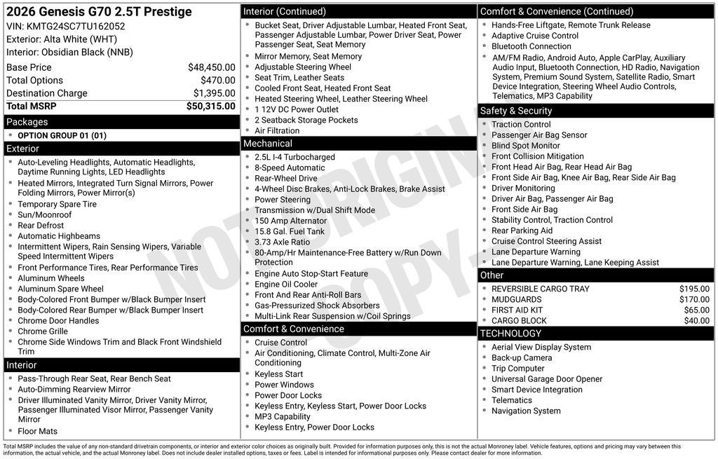 Vaden is pleased to offer 2026 Genesis G70 2.5T Prestige in Alta White, Beautifully equipped with all the essentials and then some! Option Group 01, 15 Speakers, 4-Wheel Disc Brakes, ABS brakes, Air Conditioning, Alloy wheels, AM/FM radio: SiriusXM, Android Auto & Apple CarPlay, Anti-whiplash front head restraints, Auto High-beam Headlights, Auto-dimming door mirrors, Auto-dimming Rear-View mirror, Automatic temperature control, Brake assist, Bumpers: body-color, Cargo Block, Delay-off headlights, Driver door bin, Driver vanity mirror, Dual front impact airbags, Dual front side impact airbags, Electronic Stability Control, Emergency communication system: Genesis Connected Services, Exterior Parking Camera Rear, First Aid Kit, Four wheel independent suspension, Front anti-roll bar, Front Bucket Seats, Front Center Armrest, Front dual zone A/C, Front reading lights, Fully automatic headlights, Garage door transmitter: HomeLink, Heated and Ventilated Multi-Adjustable Front Bucket Seats, Heated door mirrors, Heated front seats, Heated steering wheel, Illuminated entry, Knee airbag, Leather Seating Surfaces, Leather steering wheel, Low tire pressure warning, Memory seat, Mudguards, Navigation System, Occupant sensing airbag, Outside temperature display, Overhead airbag, Overhead console, Panic alarm, Passenger door bin, Passenger vanity mirror, Power door mirrors, Power driver seat, Power moonroof, Power passenger seat, Power steering, Power windows, Radio: AM/FM/HD Lexicon Premium Audio System, Rain sensing wipers, Rear anti-roll bar, Rear reading lights, Rear seat center armrest, Rear side impact airbag, Rear window defroster, Remote keyless entry, Reversible Cargo Tray, Security system, Speed control, Speed-Sensitive Wipers, Split folding rear seat, Steering wheel memory, Steering wheel mounted audio controls, Tachometer, Telescoping steering wheel, Traction control, Trip computer, Turn signal indicator mirrors, Variably intermittent wipers, Ventilated front seats, and Wheels: 19 x 8.0J Front and 19 x 8.5J Rear Alloy.
